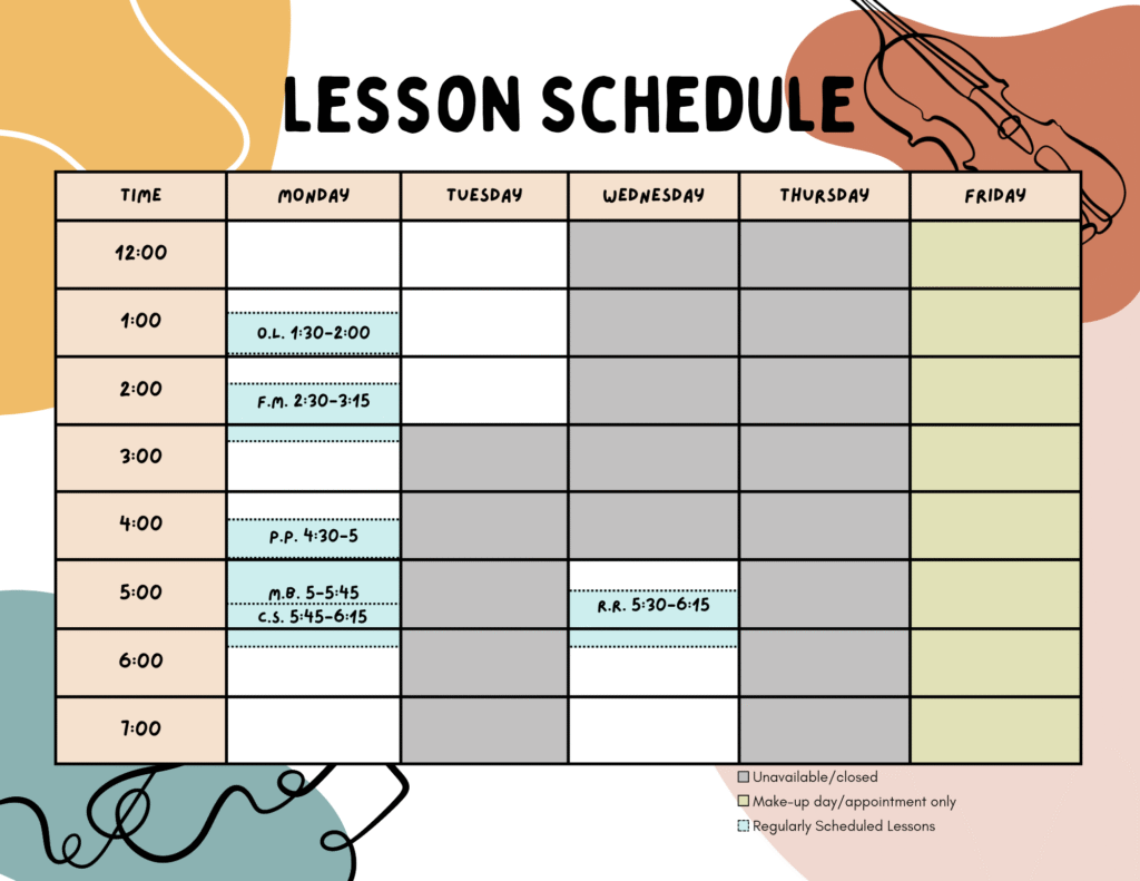 All current students and prospective students should refer to the calendar below about their weekly lesson times or availability!
